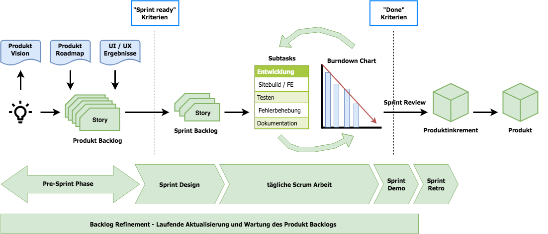 - Das resultierende Ergebnis der Pre-Sprint Phase ist der anfängliche Produkt Backlog.